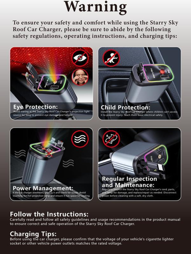Aromatic Starlight in Roof Retractable Charger with Lightning Cable, Dual Charge Port , Fast Charging Adapter -Automotive 4-In-1 Car Charger Red Light