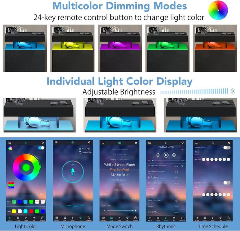 Black LED Nightstand with Charging Station 2 Outlets USB Port Type C, Bed Side Table with 2 Drawers & Wireless Charging Station, Smart LED Nightstand Modern High Gloss Night Table with Light